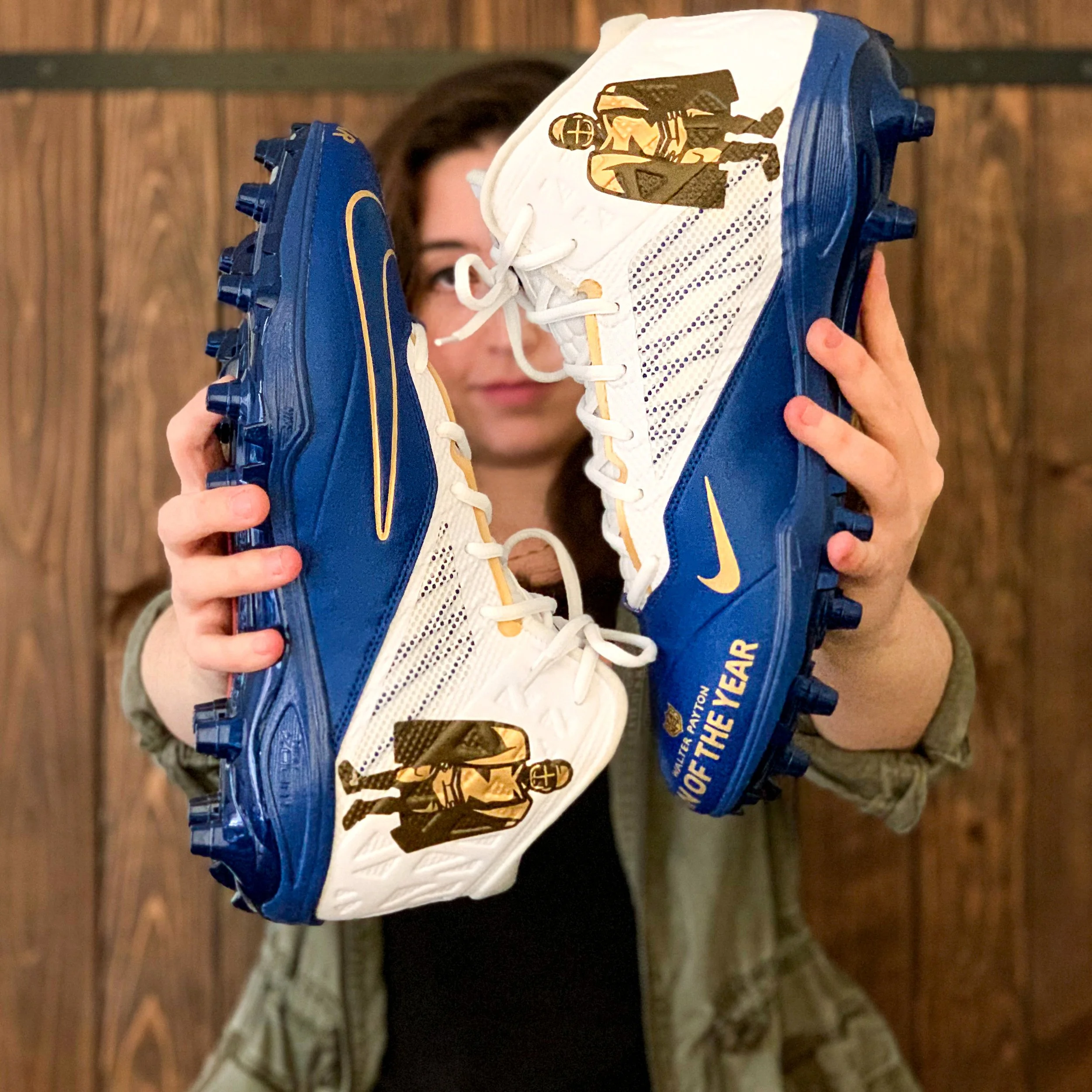 Eli Manning ‘Man of the Year themed cleats – commissioned by Excel Sports to commemorate the New York Giants’ legend QB on his NFL Man of the Year honor and charity involvement.